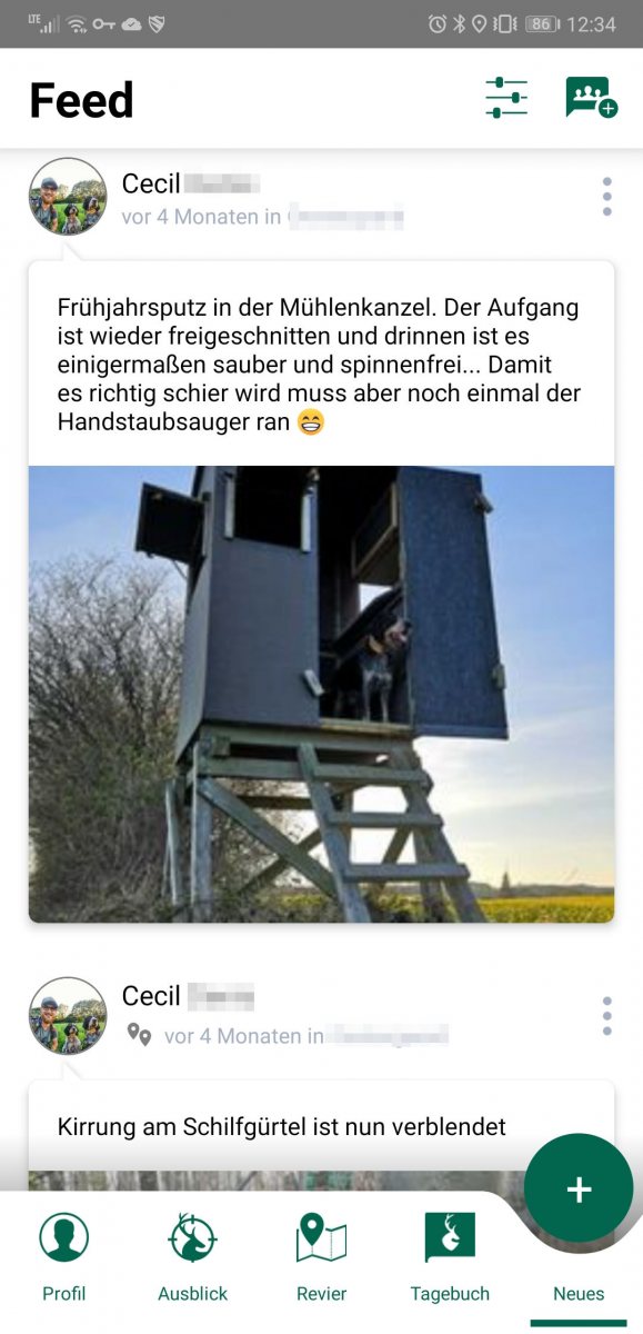 Eine weitere und gern genutzte Funktion ist “Neues”. Dies ist fast wie ein Chat aufgebaut, wo jeder User Bild und Text (auf Wunsch auch mit Standort versehen) einstellen kann. Seien es Infos wie “heute Abend bin ich auf Ansitz xy” oder “Lege gerade hier (Standort) eine Schweißfährte für Bruno” aber auch allgemeine Hinweise wie “Kirrung xy müsste besser verblendet werden, da von Spazierweg zu sehr einsehbar” sind dort perfekt übersichtlich und für alle Teilnehmer einsehbar zu hinterlegen.
