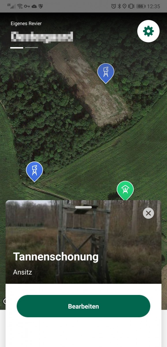 Innerhalb der Revierkarte kann ich nun direkt Einrichtungen hinzufügen. Zur Auswahl stehen Ansitze, Kirrungen, Futterstellen, Luderplätze, Fallen, Erdbauten und Wildkameras. Jeder Eintrag kann benannt und zusätzlich mit einem Foto hinterlegt werden. Ich finde das sehr praktisch um gerade als “der Neue” einen guten Überblick zu bekommen, auch wenn man nach längerer Zeit sein Revier bestimmt in und auswendig kennen wird.