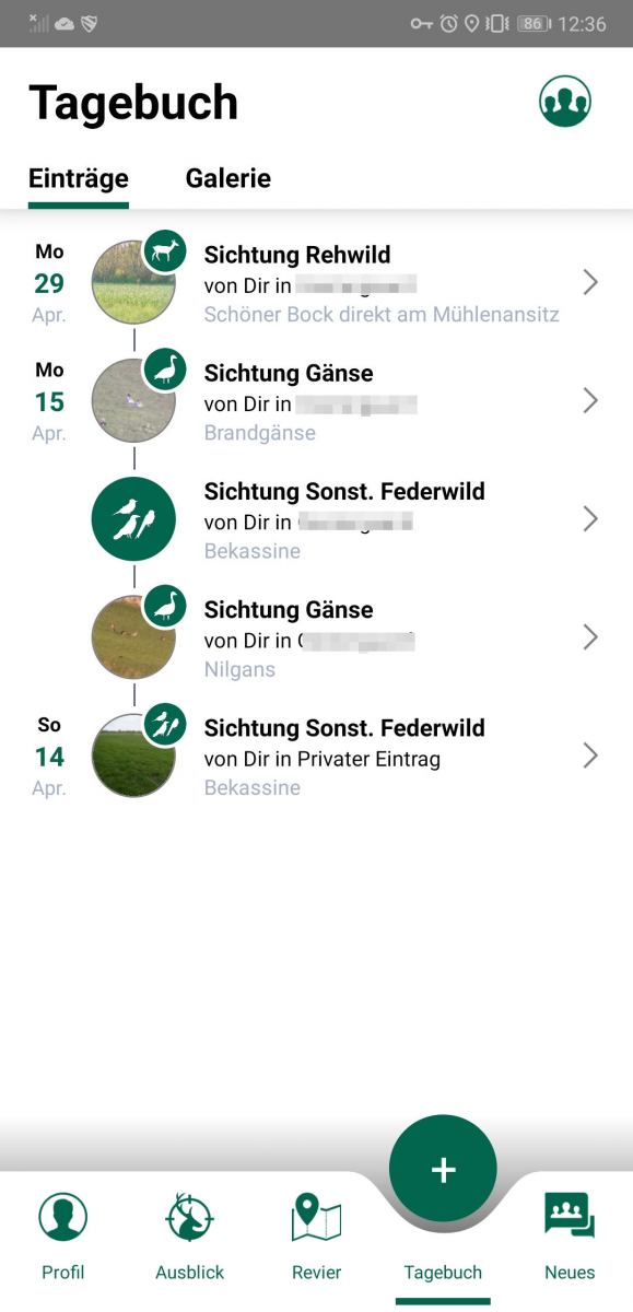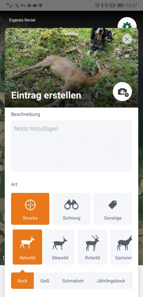 Eine weitere Funktion ist das Tagebuch. Hier kann ich Einträge quasi “privat” hinterlegen (also ohne Revierzuordnung) oder eben meinem Revier zuordnen und es somit auch für die anderen Teilnehmer sichtbar machen. Funktionen des Tagebuchs sind Hinterlegung der Strecke (hier wird auch eine große Vorauswahl an Wildarten geboten), die Ansprache von Wild (auch hier die gleiche große Vorauswahl) und Sonstiges. Jeder Eintrag kann jeweils mit Foto und dem genauen Standort, Datum und Uhrzeit hinterlegt werden, welcher dann auch auf der Hauptrevierkarte entsprechend erscheint. Diese Funktion finde ich super und Alessandra (meine Partnerin) und ich nutzen diese häufig, um jeweils den anderen bei unabhängigen Revierrunden über gemachte Entdeckungen bzw. Ansprachen zu informieren.